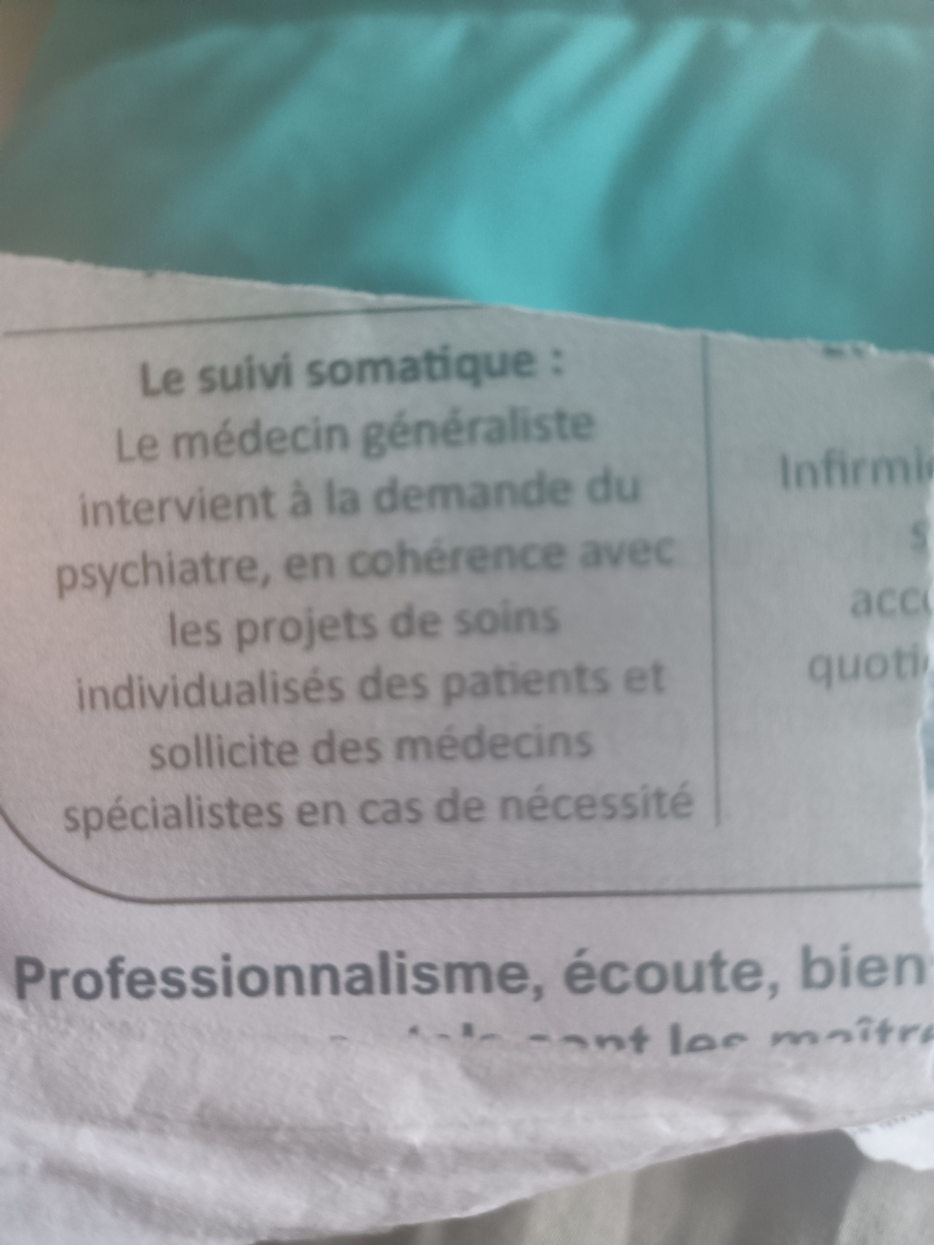 Pas digne d une maison. De santé. Vous allez être gavé de médocs mais les médecins vous ne les verrez pas. Il n y a aucune charte rien : En fonction du personnel vous n aurez pas les mêmes informations. Rien n est fait pour que vous participiez aux ateliers vous vous démerdez tout seul. Tout le monde est parano .. et le personnel dirigeant entretien le truc! Monnaie ici monnaie Donc si vous attendez qu on vous prenne en charge , Allez voir ailleurs car ici ce sont les médocs qui font le taffe rien de plus !!! Pour résumé maison psychiatrique à l ancienne ce genre de maison ne devrait même plus exister. Il y a heureusement en psychiatrie des approches plus modernes.. mais pas ici